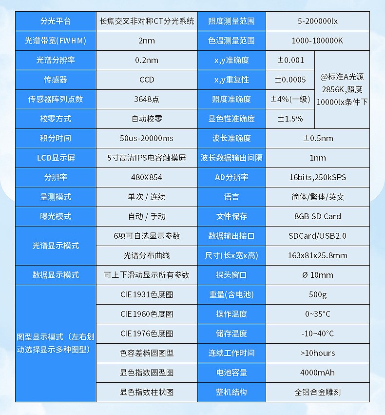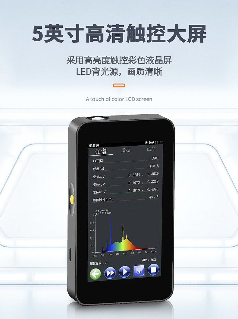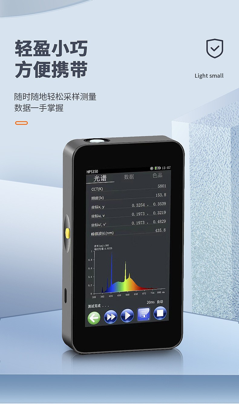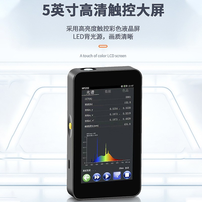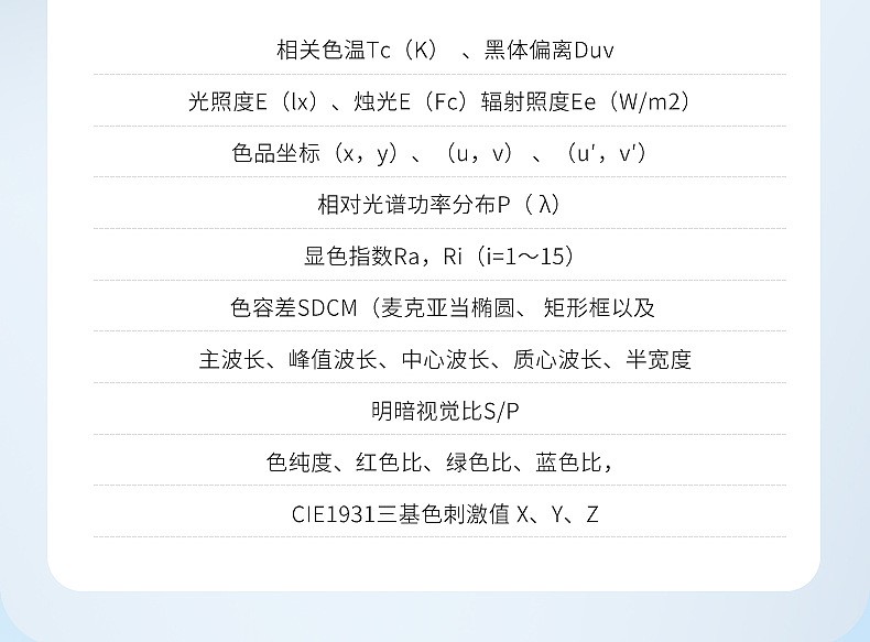 简单介绍:可测量参数:1. 相关色温 Tc (K) 、 黑体偏离Duv2. 照度、 辐照度3. 色品坐标 (x , y) 、 ( u , v) 、 (u′ , v ′)4. 相对光谱功率分布 P ( λ)5. 显色指数 Ra , Ri (i=1~15)6. 色容差 SDCM (麦克亚当椭圆、 矩形框以及 CIE u’v’圆)7. 主波长、峰值波长、中心波长、质心波长、半宽度8. 明暗视觉比S/P9. 色纯度、红色比、绿色比、蓝色比,CIE1931三基色刺激值 X 、Y 、Z
